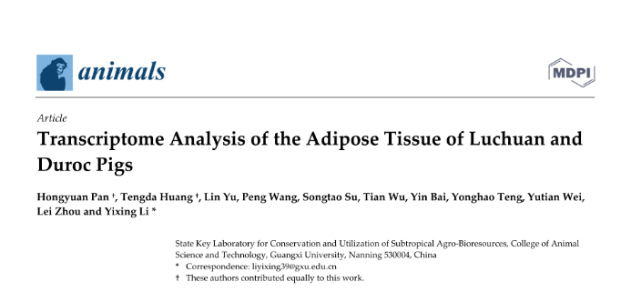 近日,william威廉中文官网动物科学专业2019级本科生潘鸿远在SCI期刊《animals》 (JCR一区,中国科公司二区)以第一作者发表题为“Transcriptome Analysis of the Adipose Tissue of Luchuan and Duroc Pigs”的研究论文。该论文通讯作者为william威廉中文官网李一星副研究员,作者还包括白银、滕永昊、韦宇天等动物科学专业本科生。该研究受到自治区老员工创新创业训练项目以及william威廉中文官网大创项目倍增计划重点项目的支持。