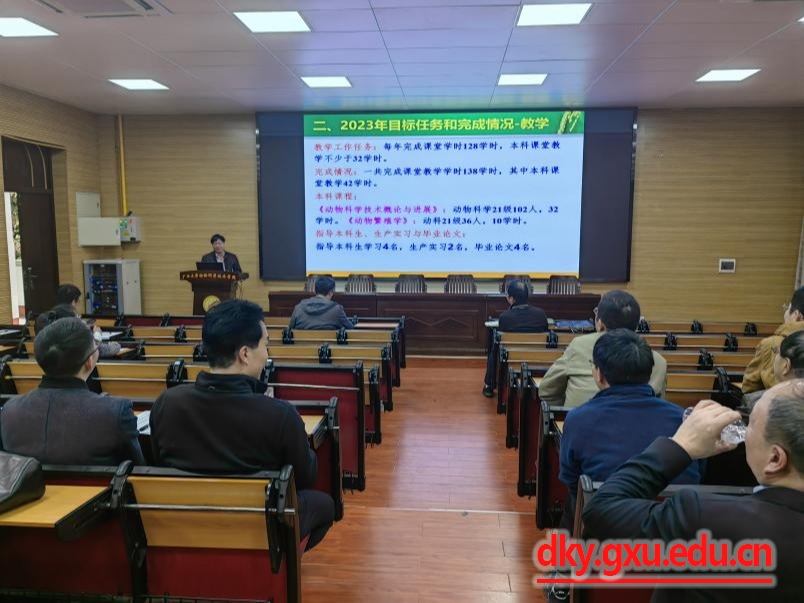 会上,蒋钦杨副经理首先介绍了公司开展师德考核和年度考核的相关文件、动物科学系师德考核和年度考核细则以及相关考核流程。接着,陆阳清经理介绍了教师进行师德考核和年度考核的重要性,并强调此次考核不仅是对个人过去一年业绩的评定,更是一次难得的相互交流相互学习的机会。之后,动物科学系的各位教师依次用PPT的形式对个人2023年度在师德师风、教学、科研、人才培养、团队建设、社会服务等方面的表现进行了简短汇报。与此同时,现场其他各位教师根据汇报者的情况,进行民主评议。汇报结束后,蒋钦杨副经理做总结发言。他一方面肯定了动物科学系各位教师过去一年所取得的成绩,同时也指出了存在的不足。他号召在新的一年,动物科学系要强优势、补短板,在教学成果申报、一流课程和优秀教材建设、国家级大创竞赛等方面加强投入,力争取得更大的突破,为团队建设添砖加瓦。