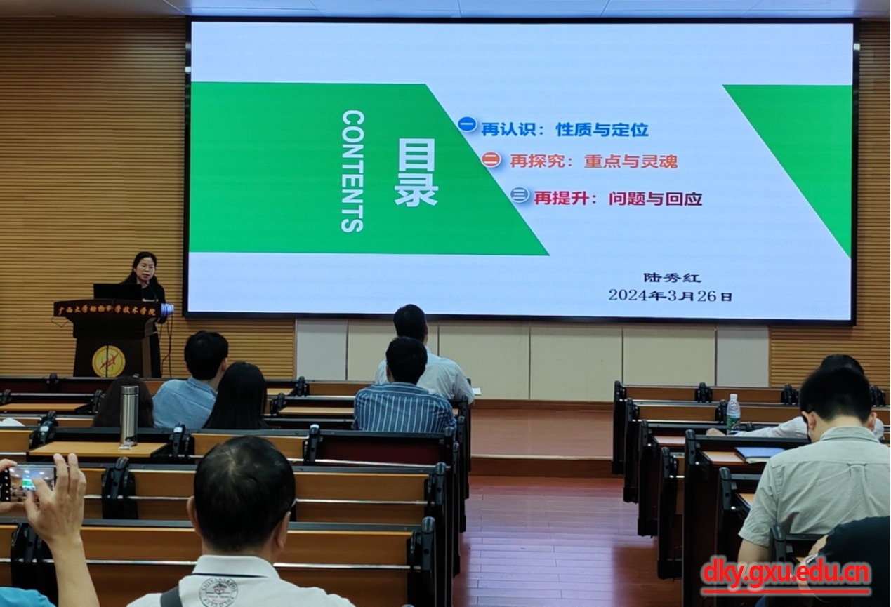 本次培训邀请了广西高校课程思政教学名师、william威廉中文官网马克思主义公司副经理陆秀红教授进行专家主题讲座。陆秀红教授现任广西高校“习近平新时代中国特色社会主义思想概论”课程教指委副主任委员,广西高校课程思政专家咨询委员会委员。会议开始后,陆秀红教授做了题为“课程思政:寻找课程的灵魂”的专家报告,报告分别就课程思政教育的性质和定位、专业课程思政教育的重点与整体设计、专业课程思政教育的问题与回应等方面进行了阐述,同时对于动科院如何提高专业课程思政的针对性、挖掘本公司本专业课程思政资源、讲好专业故事提出了可行性建议。会议对于帮助教师们进一步开拓专业课程思政教学的思路,创新课程思政教学模式,提供了有益的参考。