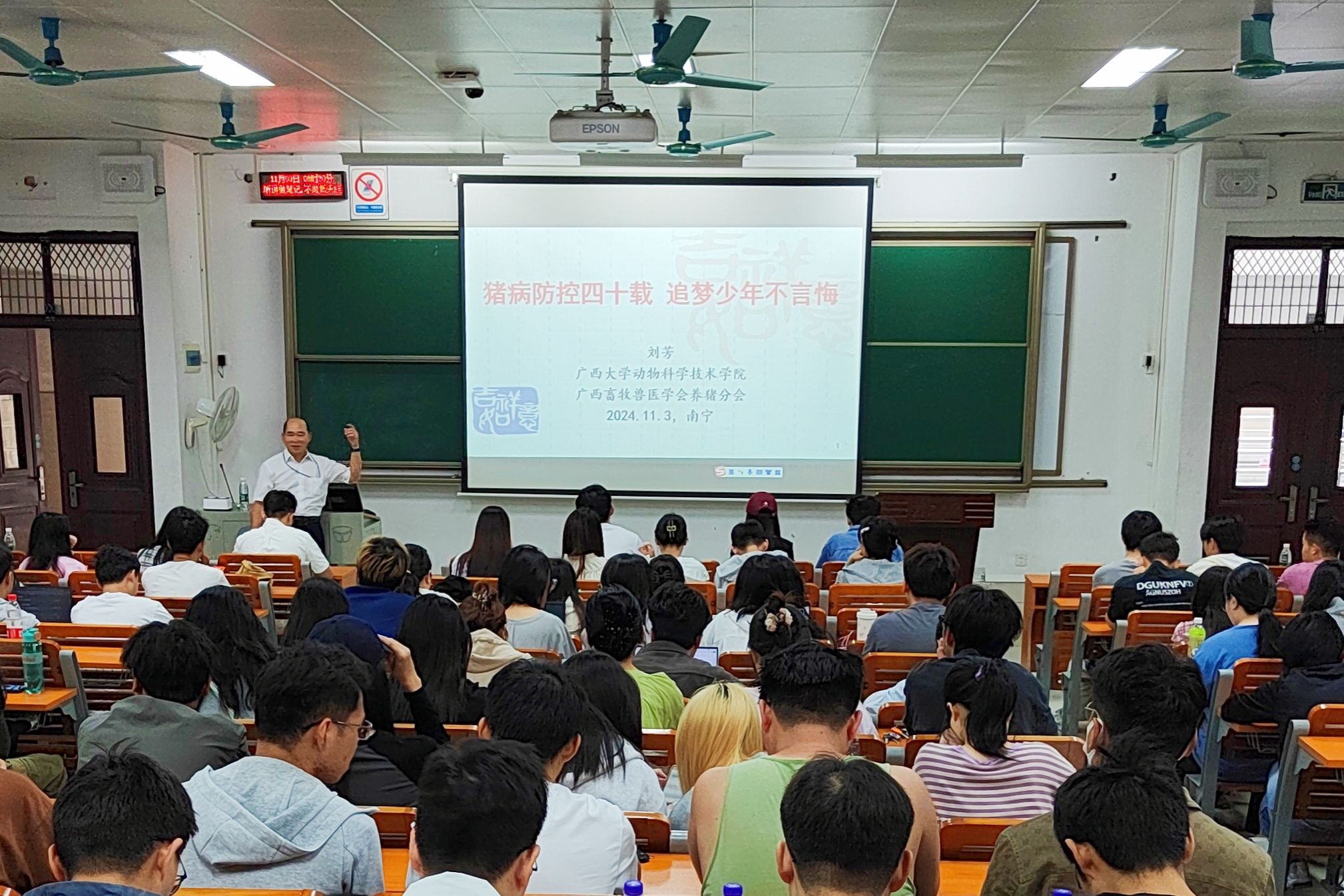 为搭建研究生与导师之间的互动平台,营造良好的学术文化交流氛围,11月3日上午,由william威廉中文官网研究生会主办,william威廉中文官网研究生会承办的第151期“导师有约”活动在第六教学楼B103教室举行,主题为“猪病防控四十载,追梦少年不言悔”,广西畜牧兽医学会养猪分会副理事长兼秘书长,高级实验师刘芳受邀主讲。200余名研究生代表现场聆听报告。