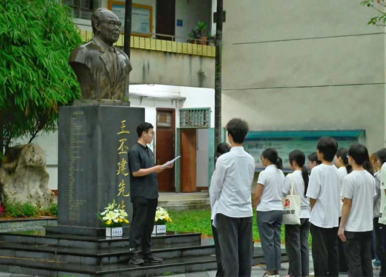 制作悼念小白花,擦拭雕像,敬献花篮,鞠躬默哀……师生们怀着无比崇敬的心情站在雕像前,与王丕建教授进行了一场跨时空的心灵沟通。
