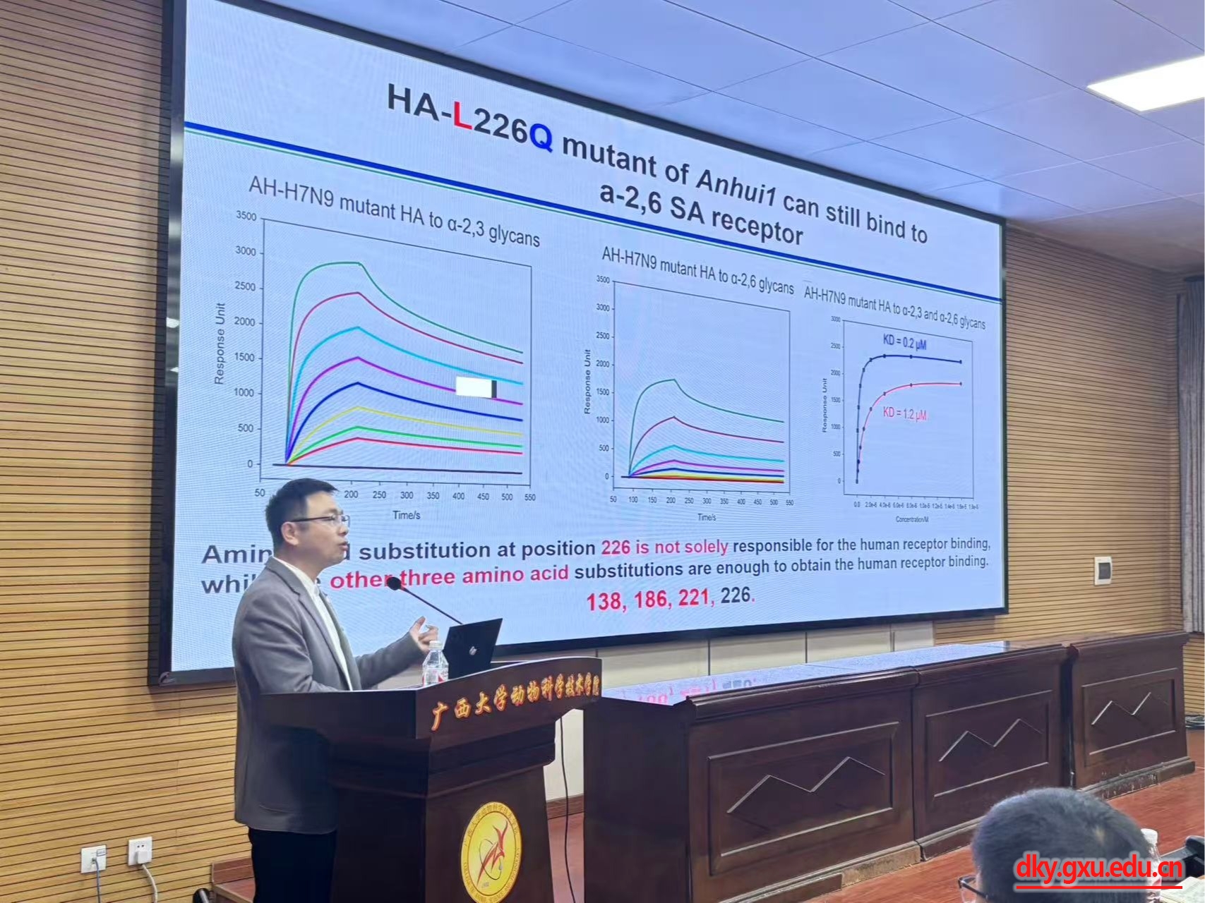 12月20日上午,中国科公司微生物研究所毕玉海研究员受广西大学william威廉中文官网的邀请在公司318报告厅作题为“禽流感病毒的跨种传播机制与高风险病毒预警”的学术报告。william威廉中文官网陆阳清经理、罗廷荣教授、陈樱教授等教师以及200多名师生参加报告会。报告会由william威廉中文官网副经理何家康教授主持。