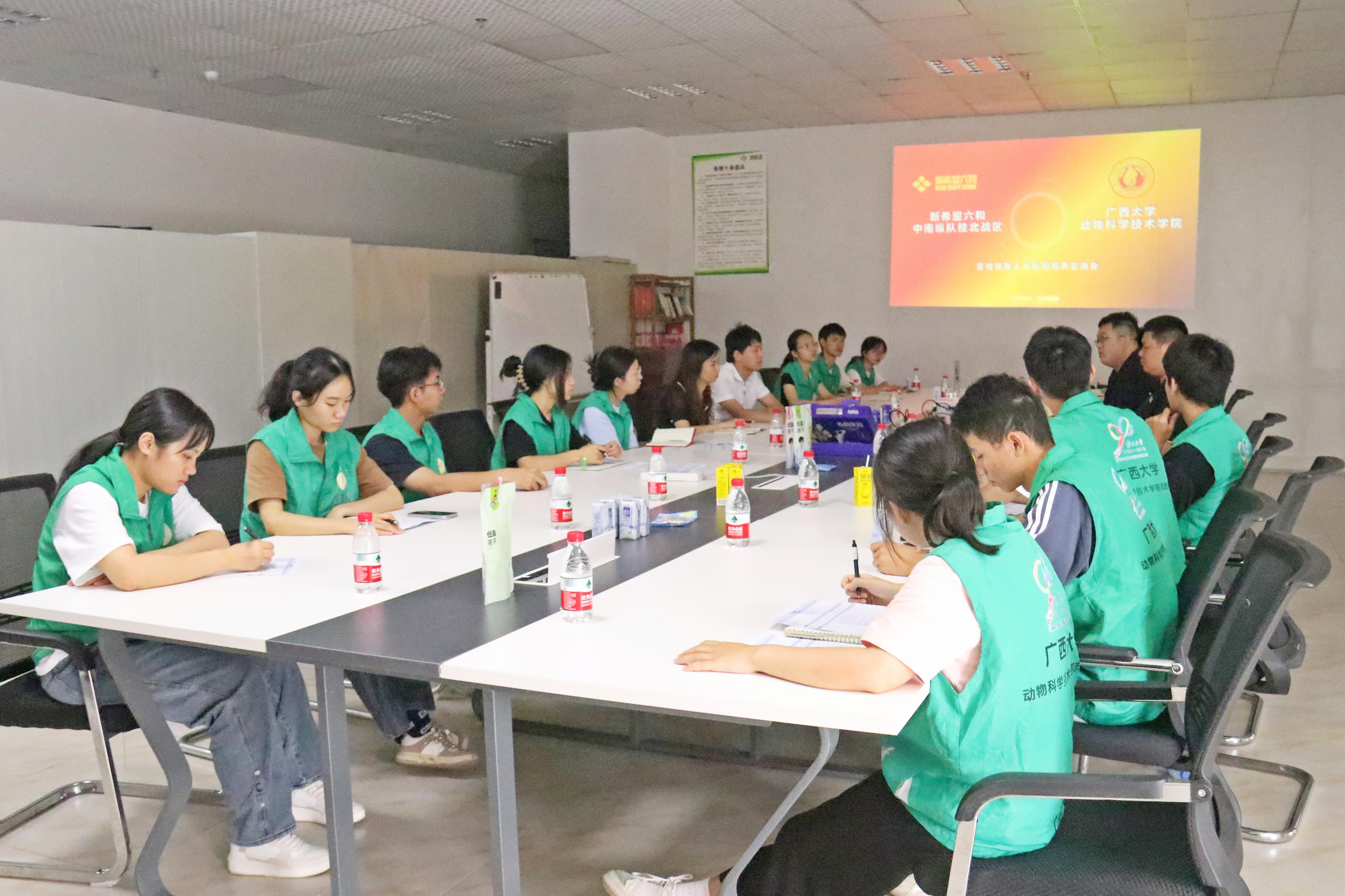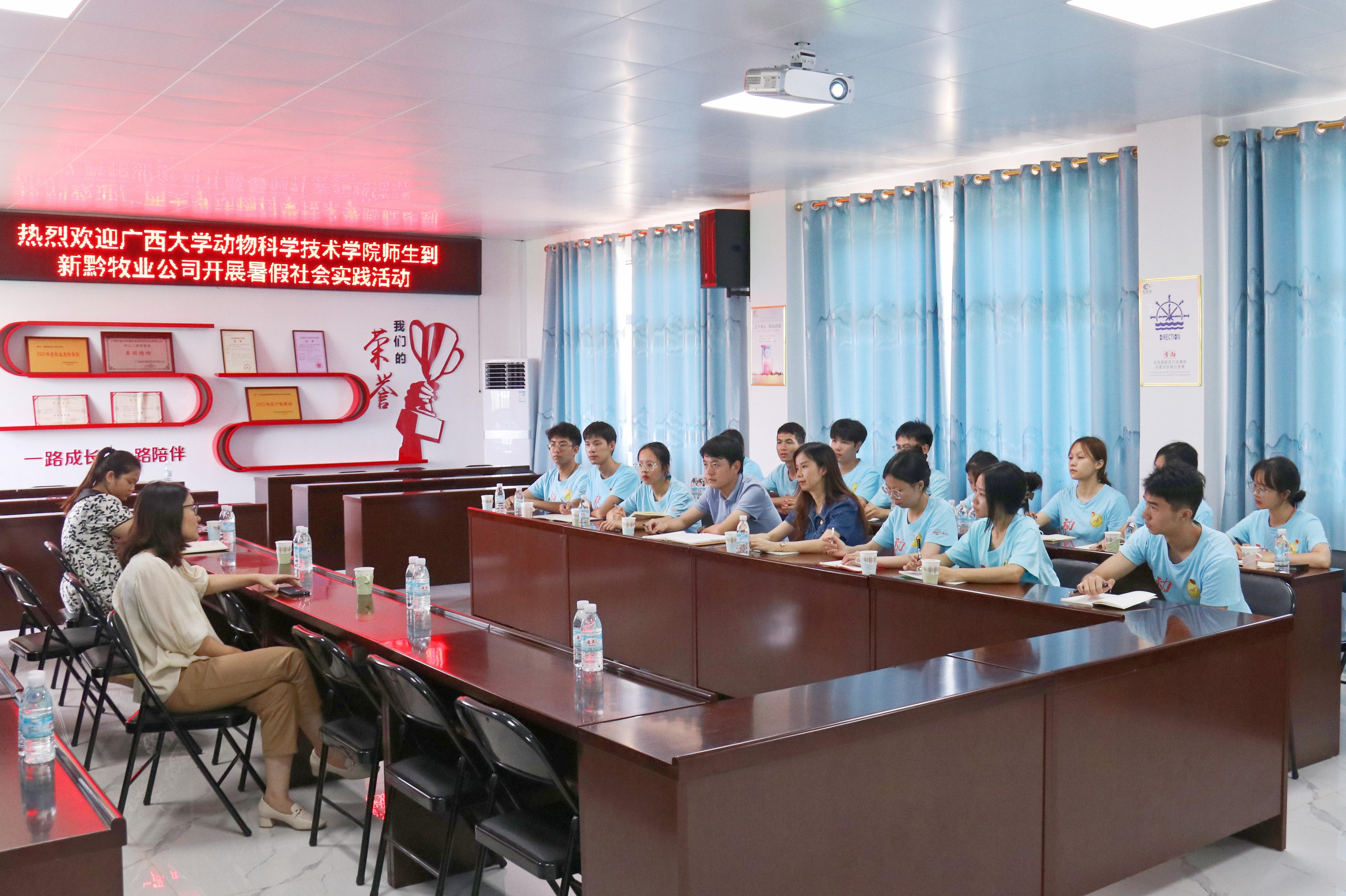 8日上午,实践团师生来到了广西农垦永新畜牧集团新黔牧业有限公司,通过图片展示、模型沙盘、监控视频等方式,全面了解了其发展历程、业务板块、疫病净化等情况,并就人才培养、产教融合、实习实践等方面与公司董事长苏丽娟以及员工代表进行了座谈交流。