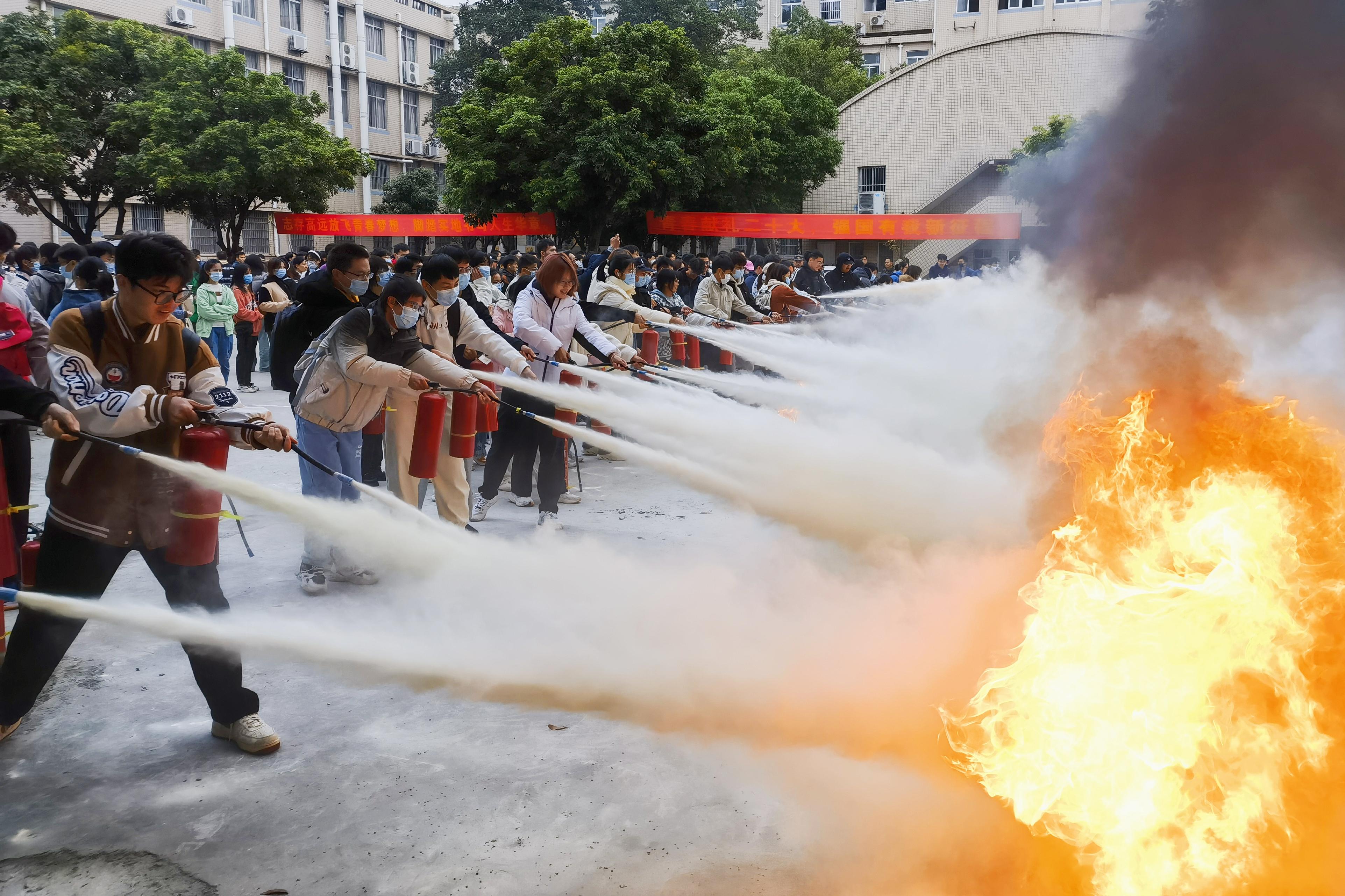 之后,同学们在现场进行了灭火器、消防水带的操作演练。