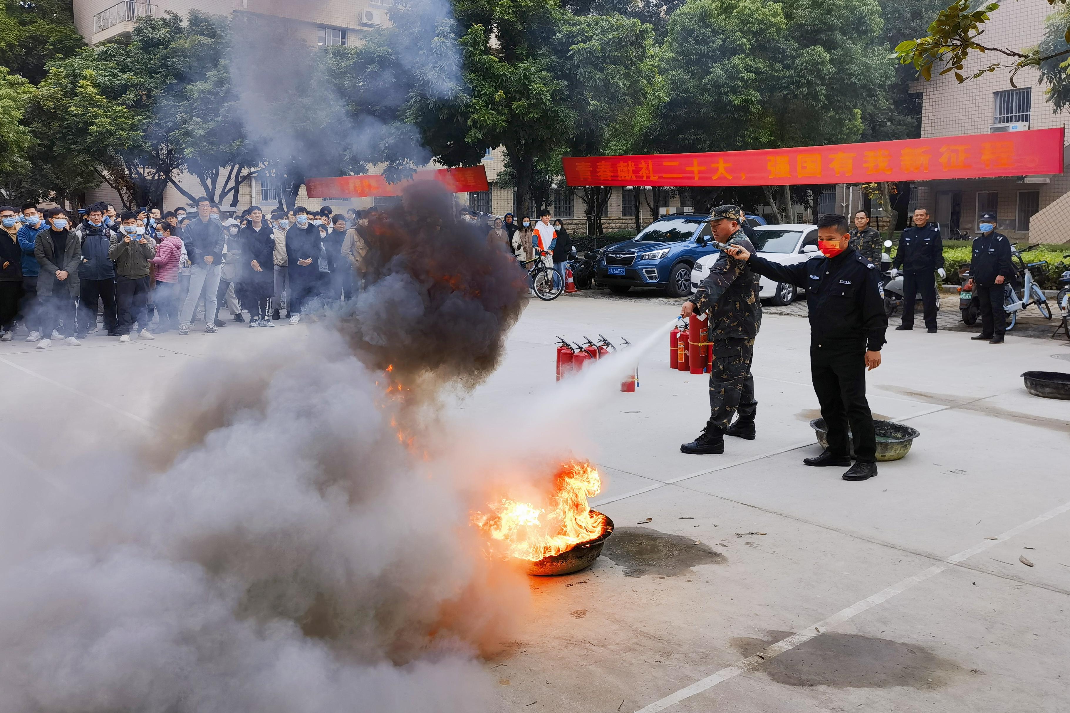 首先,保卫处黄光电同志结合公司案例,向同学们分析了校园火灾形成的原因和特点,并讲解了灭火器和消防水带等不同消防器材的使用方法和注意事项。