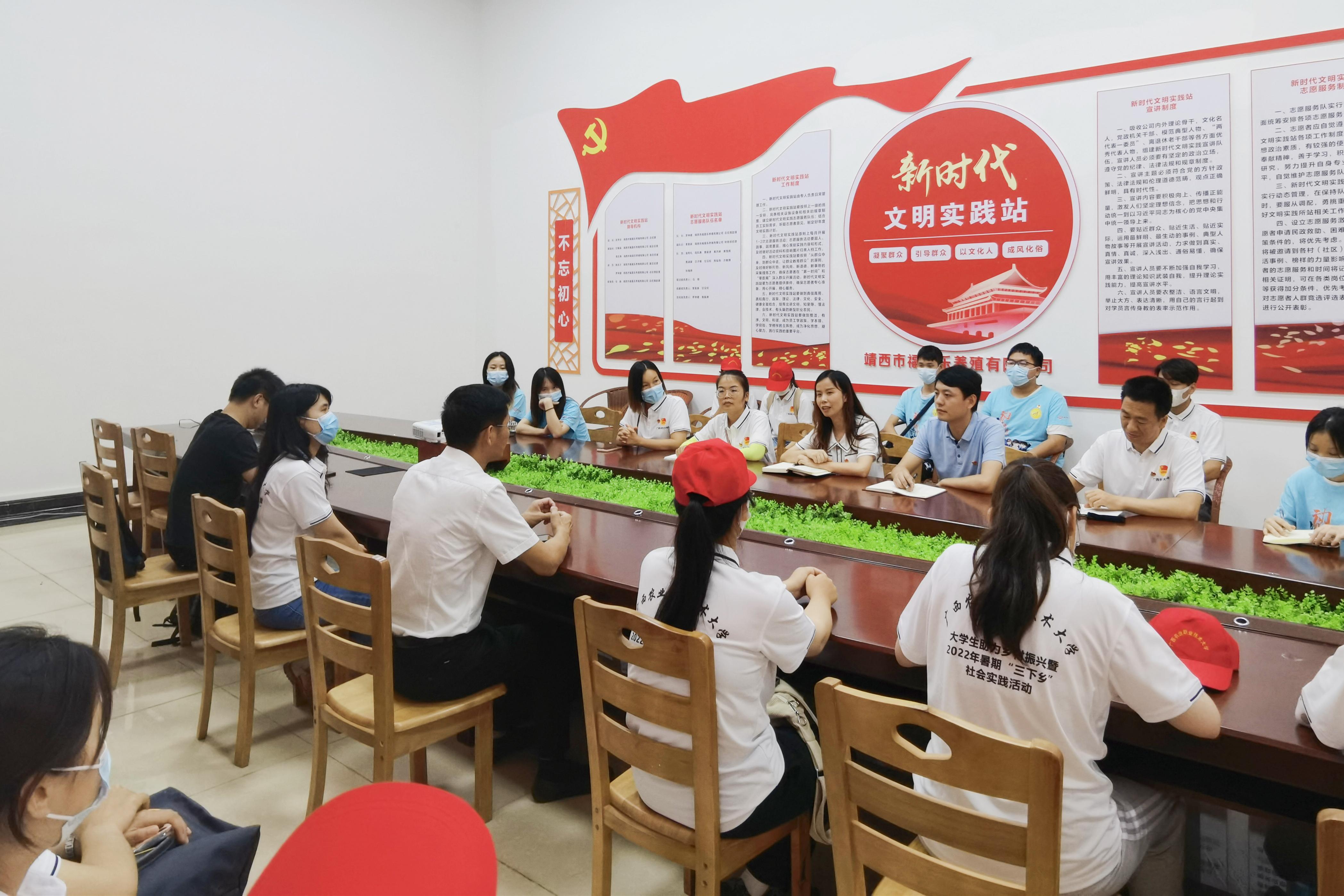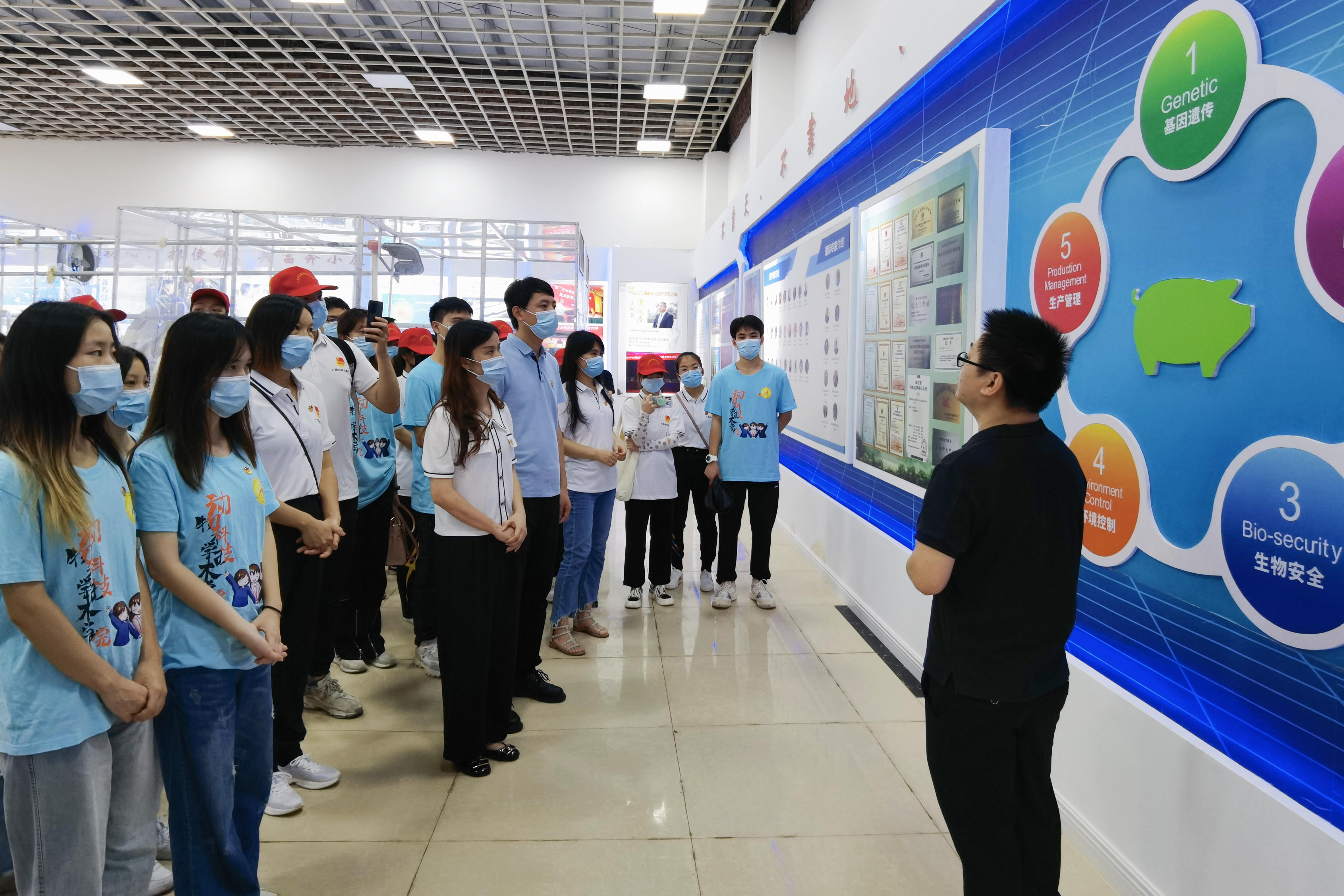 8日下午,实践团师生实地参观了靖西市福喜乐生态扶贫母猪产业核心示范区,并详细了解了福喜乐集团打造的“政府主导+农户主体+金融支撑+企业引领+合作社纽带+供应链平台”六位一体生猪产业化联合体的运营模式。