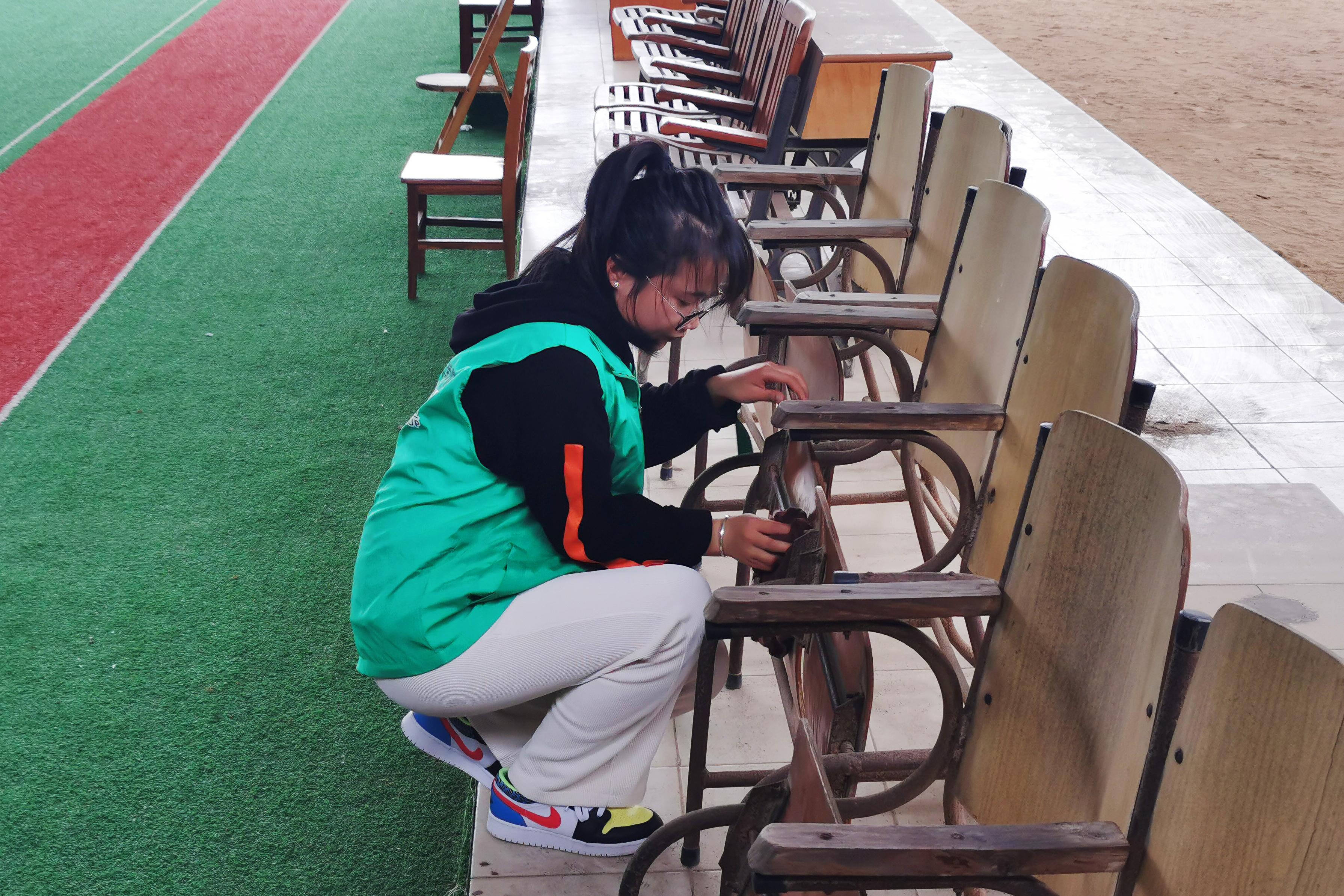 志愿者们身穿绿马甲,拿着抹布、扫帚、拖把、锄头、铲子等工具,分工协作,相互配合,对活动中心内的垃圾、杂草、树枝等进行清理。经过两个小时的辛勤劳动,活动中心焕然一新。