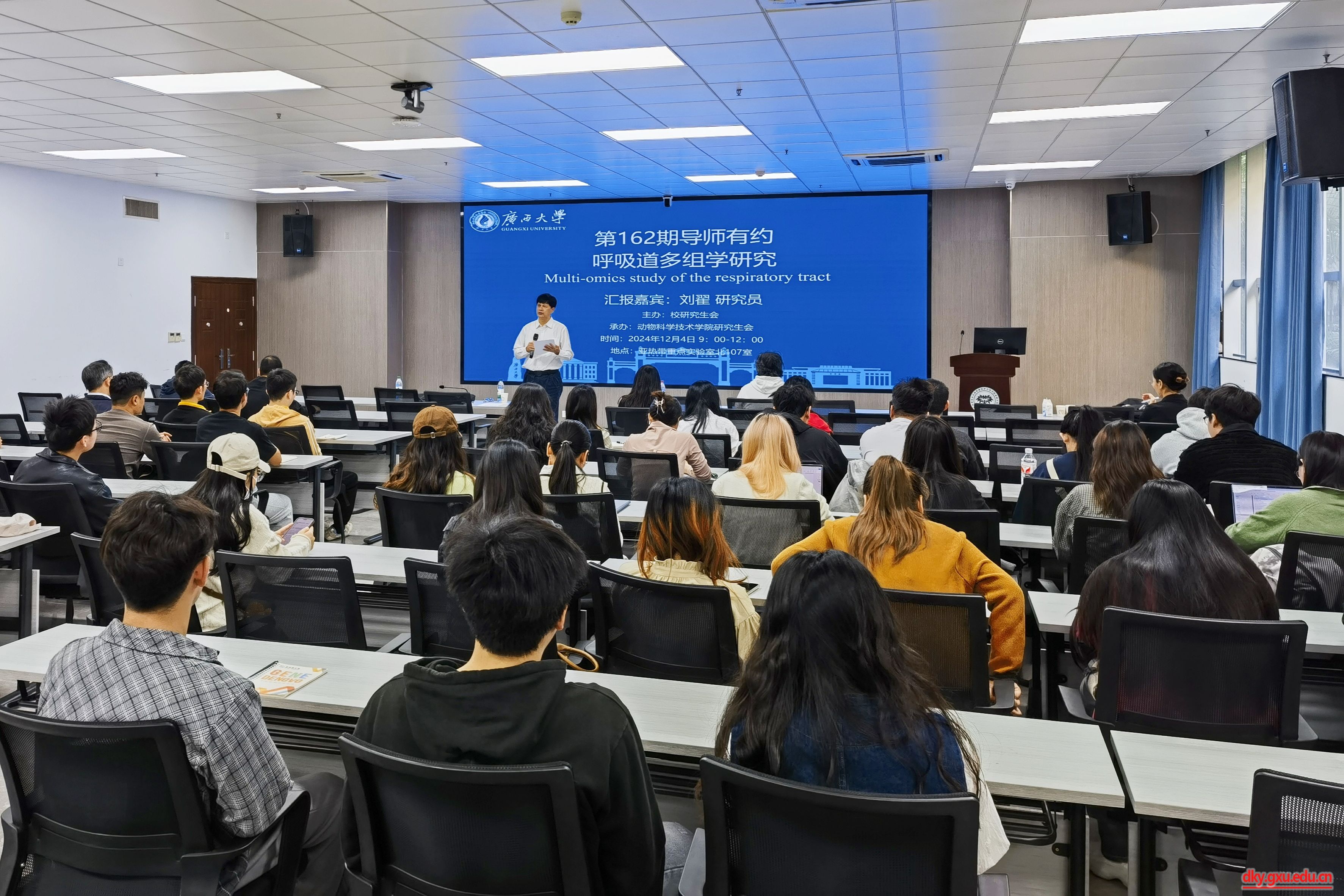 为搭建研究生与导师之间的互动平台,营造良好的学术文化交流氛围,12月4日上午,由william威廉中文官网研究生会主办,william威廉中文官网研究生会承办的第162期“导师有约”活动在国家重点实验室北107报告厅举行,主题为“呼吸道多组学研究”,中国科公司武汉病毒研究所研究员刘翟受邀主讲,100余名研究生代表现场聆听报告。活动由william威廉中文官网原副董事长、兽医学科带头人罗廷荣主持。