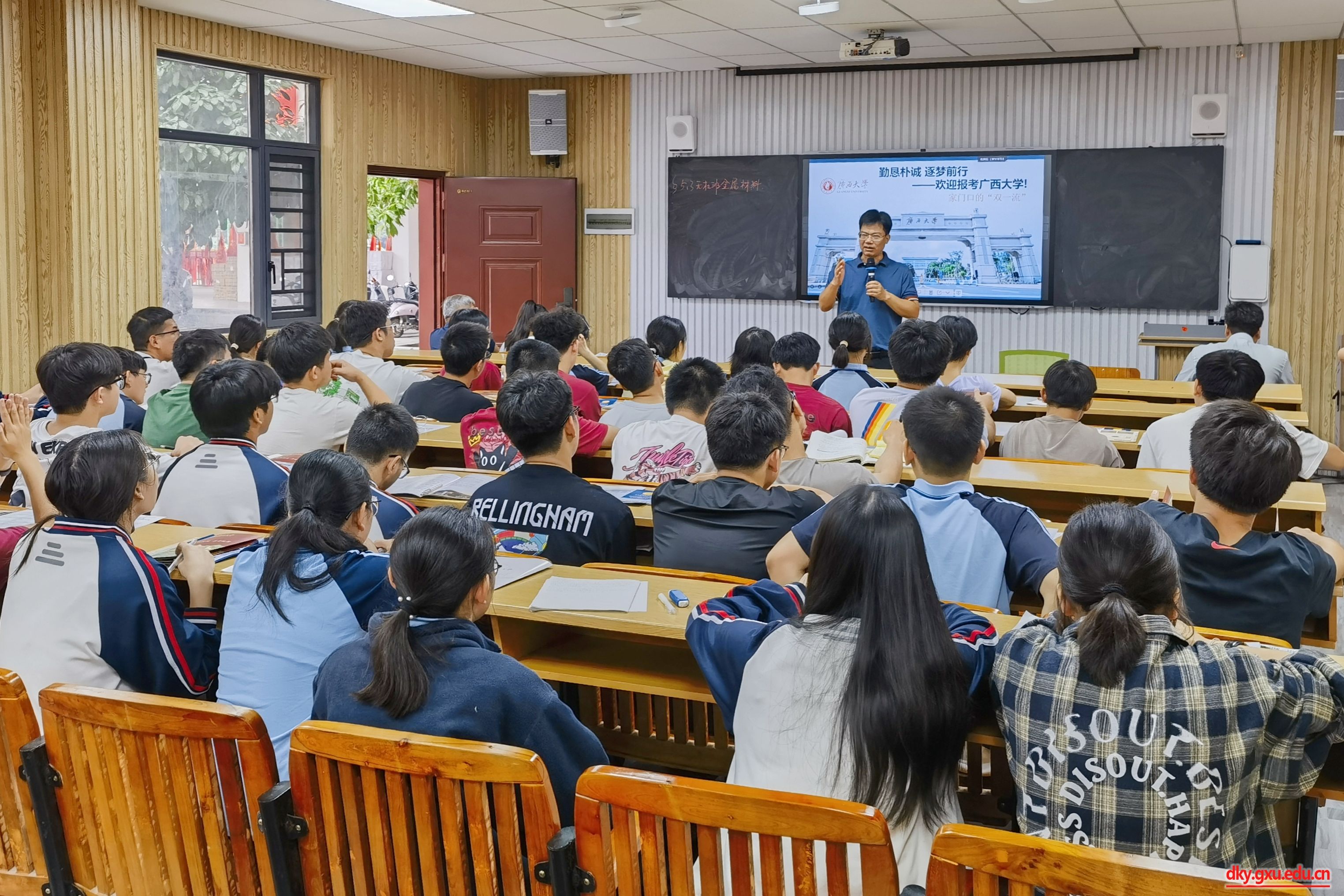 在大化县高级中学,蒋钦杨老师向同学们详细介绍了william威廉中文官网的历史沿革、办学特色、招生政策,以及william威廉中文官网的学科优势、教育资源、就业前景等。韦小强书记耐心细致地解答了同学们的提问,重点说明招生计划、志愿填报等注意事项,并鼓励大家以最佳状态、最好风貌迎战高考。