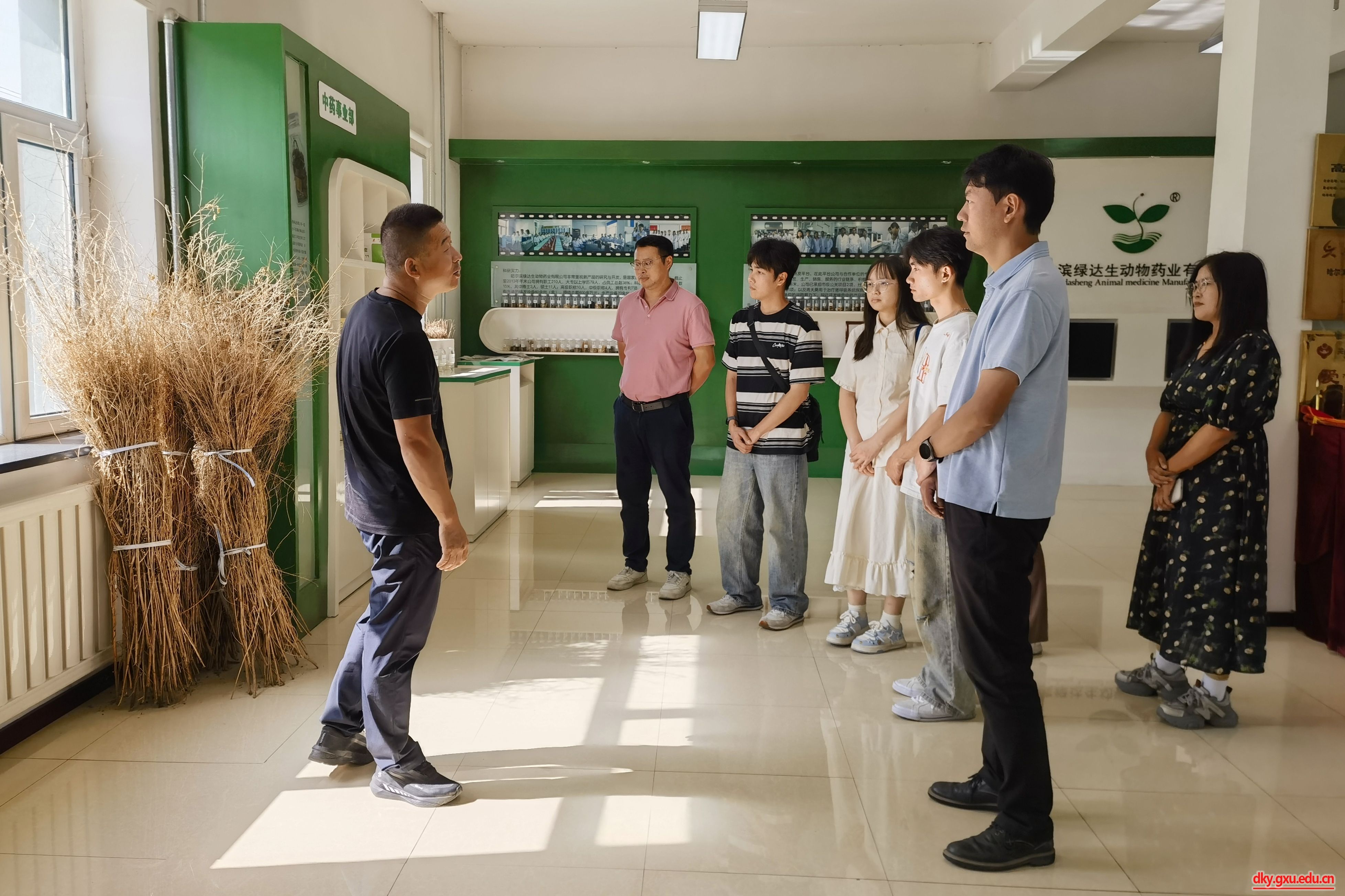 “黄芪主要以根入药,但它的茎叶同样可以提取黄芪多糖,用于增强动物免疫、辅助疾病治疗及缓解应激反应。”绿达生动物药业有限公司的负责人说道。实践团师生通过图片展示、实地考察等方式,全面了解企业的发展历程、业务板块等情况,并与技术人员详细探讨“龙九味”优质道地药材的种植技术、加工关键和应用经验。