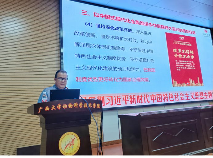 杨勇教授从“习近平新时代中国特色社会主义思想的世界观和方法论、习近平新时代中国特色社会主义思想的重要组成部分和以中国式现代化全面推进中华民族伟大复兴的使命任务”三个部分深刻阐述了习近平新时代中国特色社会主义思想的丰富内涵,用通俗易懂的语言加深大家对习近平新时代中国特色社会主义思想的理解。