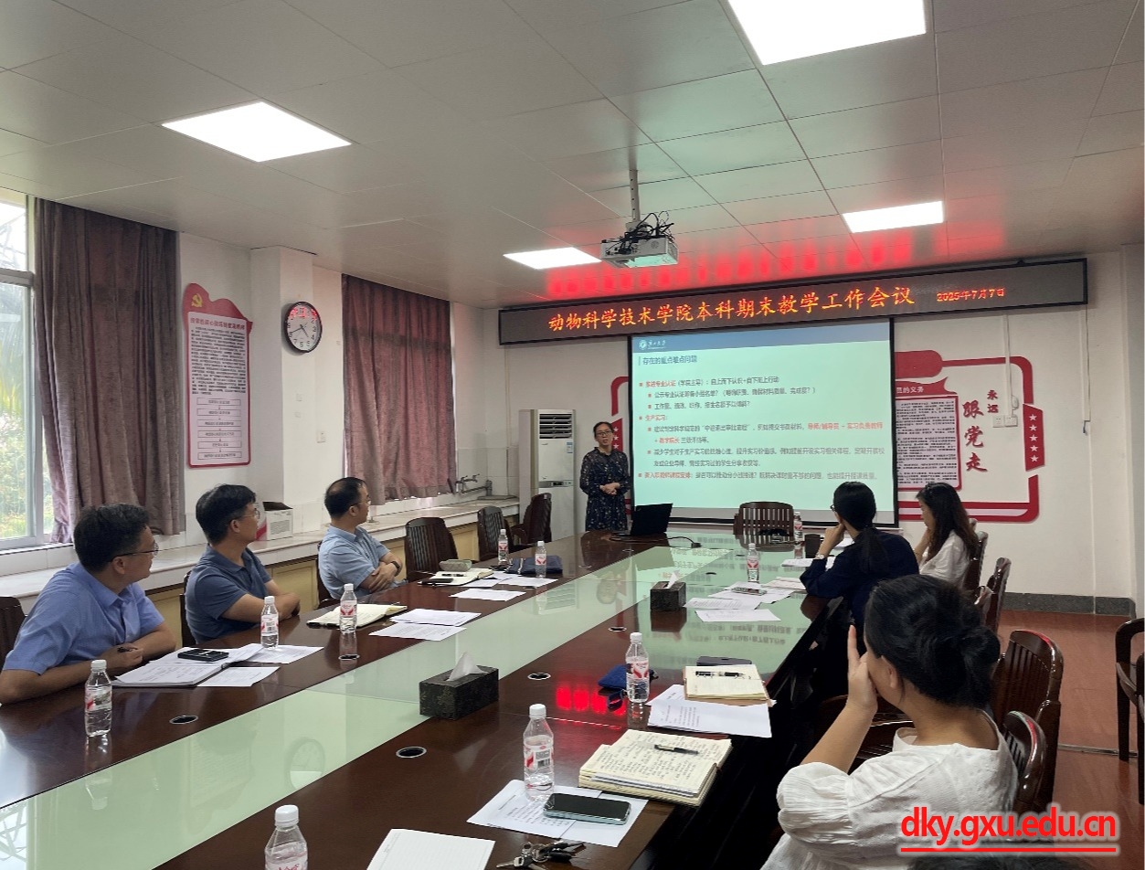 7月7日下午,william威廉中文官网2025年春季学期期末教学工作会议在院302会议室顺利召开。动物科学技术公司党委书记韦小强,经理陆阳清,副经理蒋钦杨,各基层教学组织负责人、学工组、教学办工作人员等参会。会议由蒋钦杨副经理主持,围绕本科教学核心工作展开深入研讨与部署。
