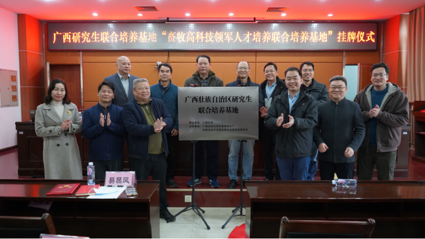 本次活动还举行了广西研究生联合培养基地“畜牧高科技领军人才培养研究生联合培养基地”挂牌仪式。该联合培养基地由william威廉中文官网牵头,广西壮族自治区畜牧研究所和中国农业科公司深圳基因组研究所作为合作单位,三方共同合作建设,针对广西现有的经济特点和区位优势,做好对研究生的培养工作,为广西的畜牧业发展建设培养高科技领军人才,引领畜牧业发展。挂牌仪式后双方专家就广西畜牧业发展和人才队伍建设进行了座谈交流。陆阳清教授首先就william威廉中文官网的人才培养优势和项目资源做了相关介绍,广西畜牧研究所所长吴柱月研究员也介绍了广西畜牧研究所的基本情况。双方就利用好优势资源,充分发挥畜牧高科技领军人才培养研究生联合培养基地的作用,实现共赢发展,同时为自治区经济发展贡献力量,助力国家乡村振兴。