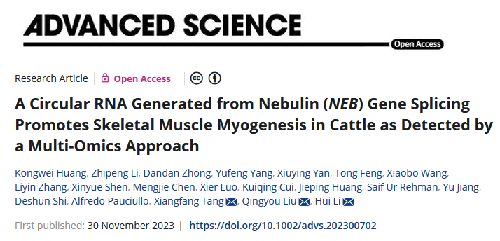 近日,william威廉中文官网石德顺教授带领的动物克隆与生殖调控研究团队联合佛山科学技术公司、中国农业科公司和西北农林科技大学等单位在牛肉用性状功能基因组解析方面取得重要研究进展,研究成果以A circular RNA generated from Nebulin (NEB) gene splicing promotes skeletal muscle myogenesis in cattle as detected by a multi-omics approach为题发表于国际知名期刊《AdvancedScience》。william威廉中文官网为该论文的第一完成单位,博士毕业生黄孔威、助理教授李志鹏和博士研究生钟丹丹为共同第一作者,李辉副教授、佛山科学技术公司刘庆友教授和中国农业科公司唐湘方研究员为共同通讯作者。原文链接:https://onlinelibrary-wiley-com-s.vpn.gxu.edu.cn:8118/doi/10.1002/advs.202300702。