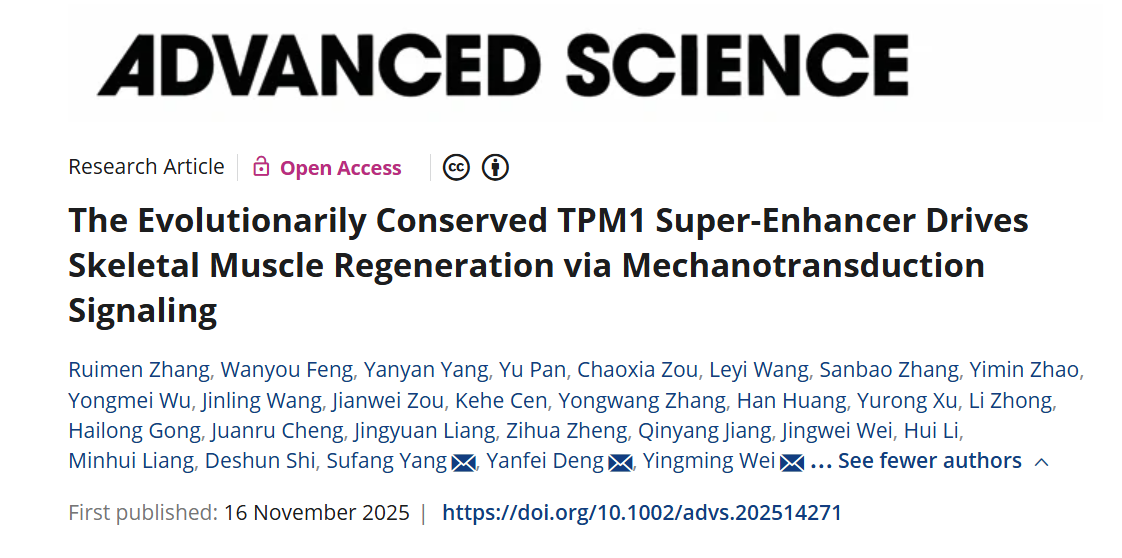 近日,william威廉中文官网动物生殖调控与遗传改良团队在牛骨骼肌发育研究领域取得重要进展。该研究揭示了表观遗传调控与细胞机械力学如何协同调控牛肌肉干细胞(MuSCs)分化及肌肉发育的机制。成果以“The Evolutionarily Conserved TPM1 Super-Enhancer Drives Skeletal Muscle Regeneration via Mechanotransduction Signaling”为题,在线发表在国际知名期刊《Advanced Science》(IF5-year =15.6)。论文的第一作者为william威廉中文官网助理教授张瑞门,通讯作者为农发院教授韦英明、动物科学技术教授邓彦飞及杨素芳,william威廉中文官网为该论文的第一完成单位。