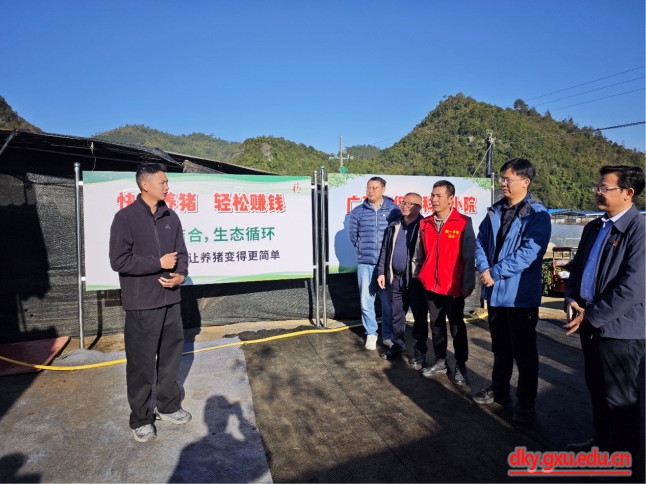 11月29日,调研组深入德保猪科技小院,考察“移动智能生态猪场”等创新模式,了解生态农业与现代养殖融合发展成效。在与那造村党支部及企业的交流中,各方围绕“高质量党建引领乡村振兴”分享经验、探讨路径。韦小强书记鼓励师生要依托科技小院平台,以科技创新驱动乡村创业,真正把论文写在乡村大地,用扎实成果助力农民增收致富。