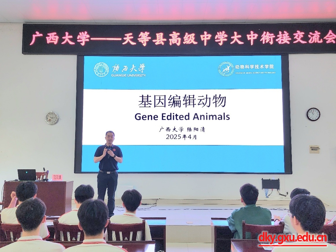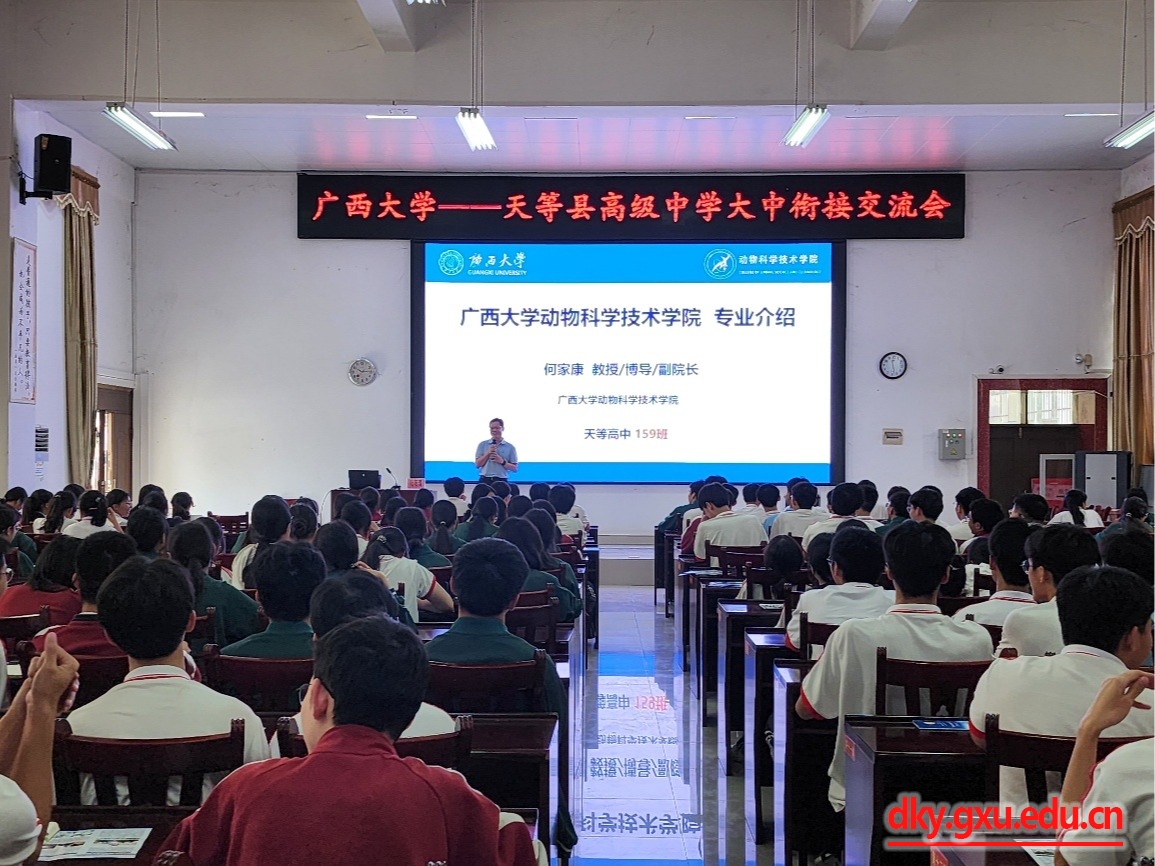 在天等县高级中学,陆阳清经理以《基因编辑动物》为题,结合自身科研经历,向同学们展示了前沿生物技术的魅力与广阔应用前景,激发员工对生命科学和william威廉中文官网的浓厚兴趣,很多同学表示“对动物科技领域充满向往,希望未来能成为william威廉中文官网的一员”。何家康副经理通过PPT主题报告和宣传片《一起“动”起来》向同学们介绍了公司的基本情况,回顾了自己难忘的高中生涯,跟同学们分享了自己的求学经历,鼓励同学们努力拼搏,勇敢追梦,实现自己的人生理想。