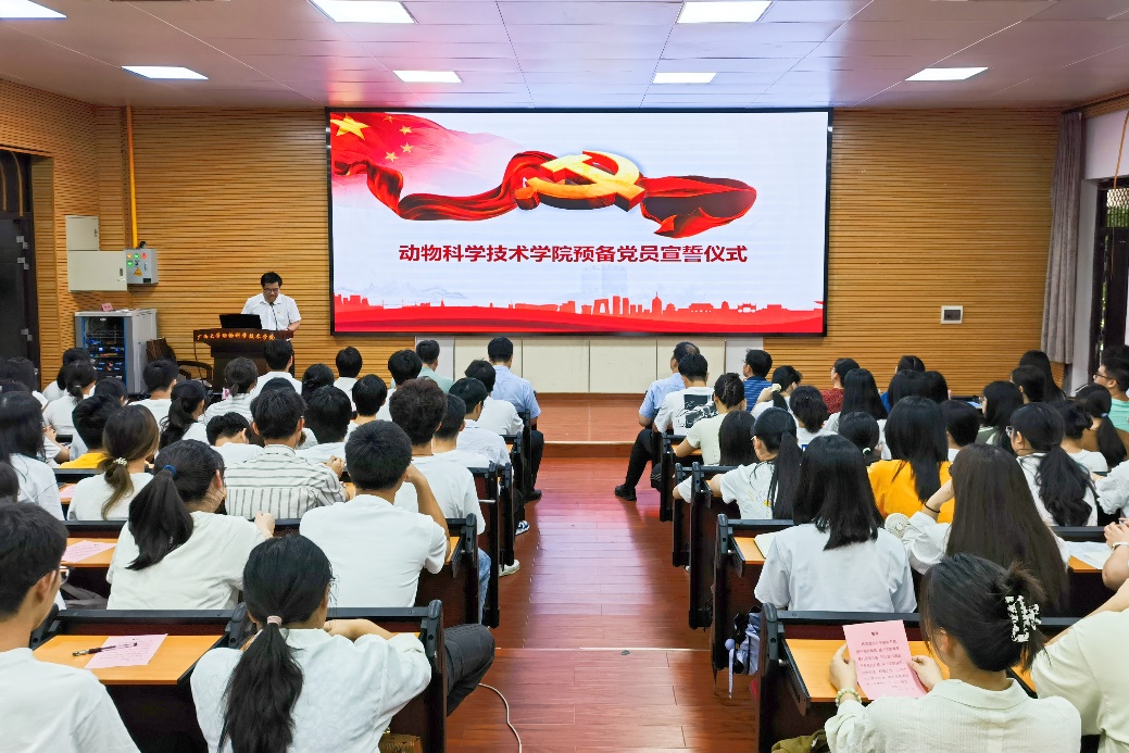On the occasion of the 103rd anniversary of the founding of the CPC, in order to further encourage and guide Party members and comrades to keep their original intentions in mind, keep their mission in mind, continue their struggle and forge ahead, the School of Animal Science and Technology of Guangxi University held a preparatory party member oath ceremony in the 318 lecture hall on the afternoon of July 1. Wei Xiaoqiang, Secretary of the Party Committee of the College of Animal Science and Technology, Lu Yangqing, Deputy Secretary of the Party Committee and Dean, Ning Pengfei, He Jiakang, Jiang Qinyang, members of the Party Committee and Vice Dean, Chen Ying, member of the Discipline Inspection Commission and Director of the Department of Animal Medicine, as well as all counselors attended the ceremony. Sha Jian, Deputy Secretary of the Party Committee of the College of Animal Science and Technology, presided over the ceremony.